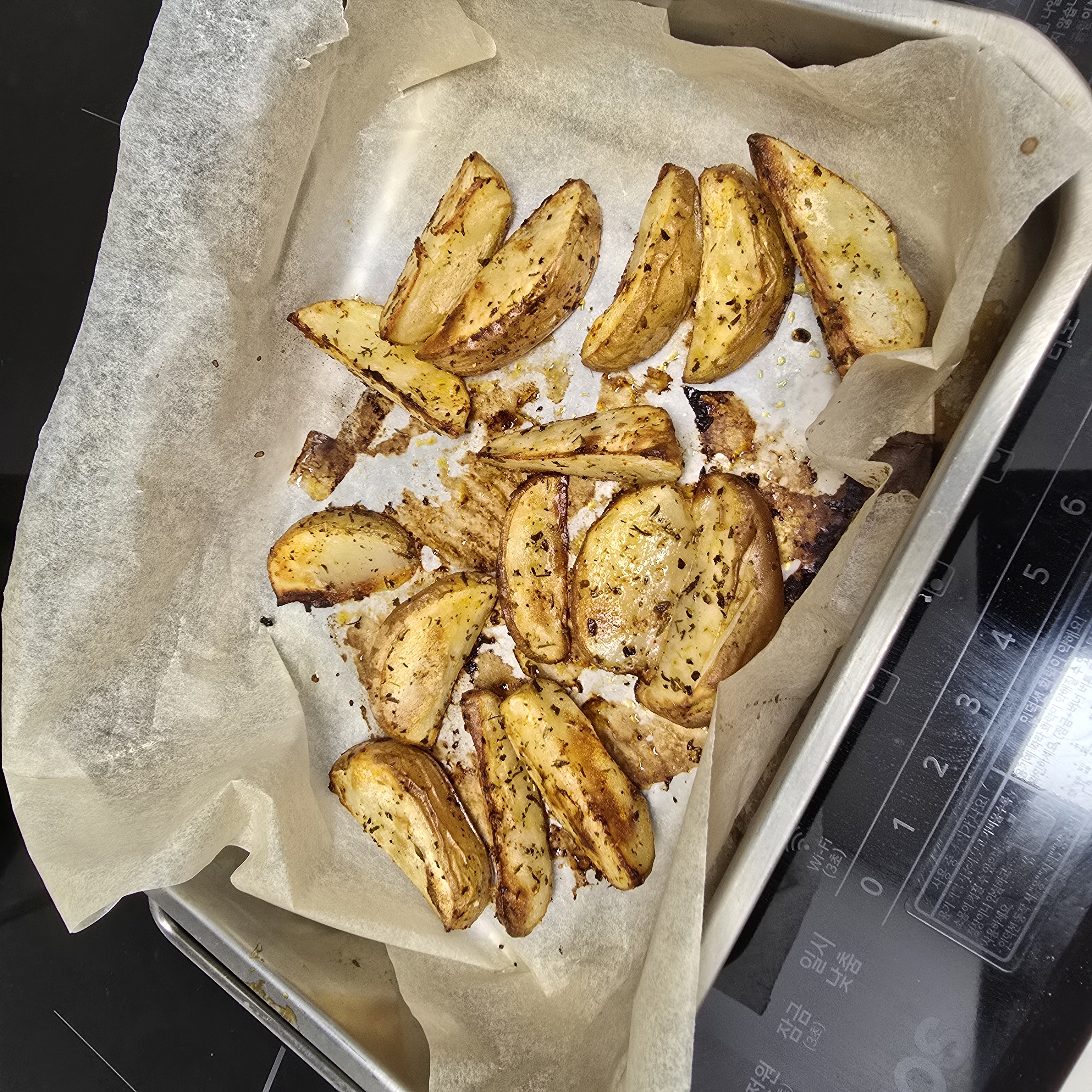 3. 팬에 종이 호일과 노란 포포토를 놓고 올리브 오일을 균일하게 뿌려줍니다.