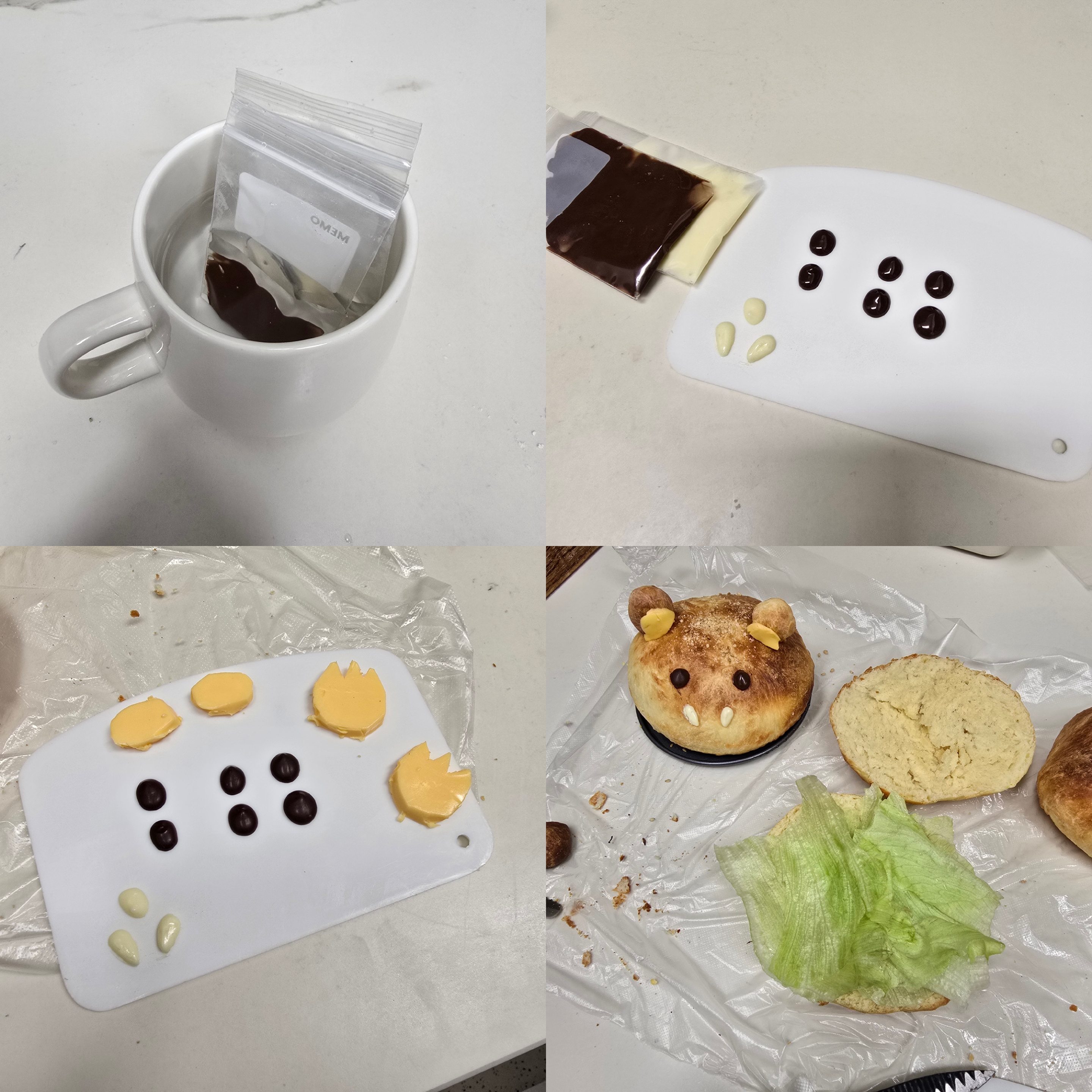 3. 치즈 조각과 초코 눈 초코 이빨을 붙여줍니다. (초콜릿 or 온기로 붙일 수 있음)