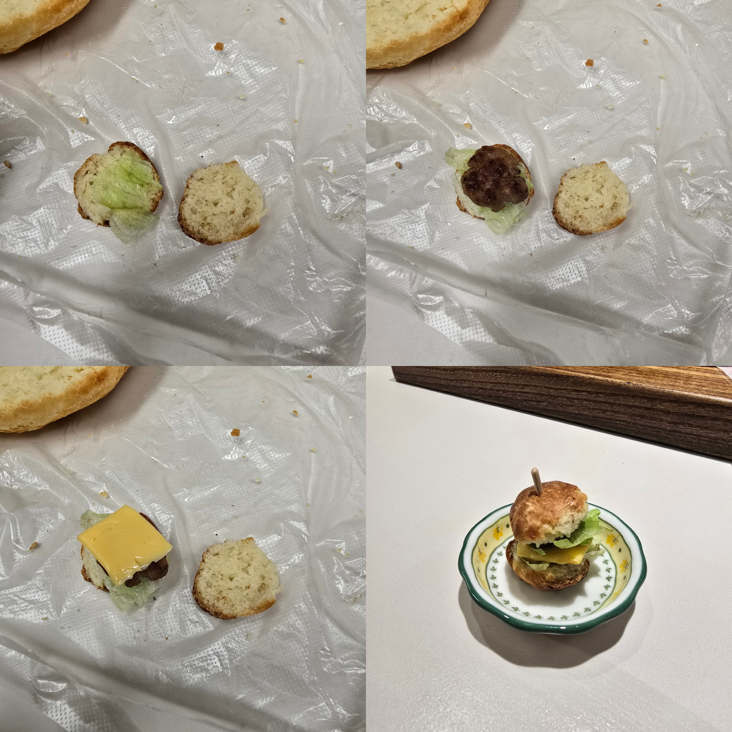 + 그 사이에 몰래 준비한 미니 버거 재료도 양파를 제외하고 열심히 쌓아 줍니다.