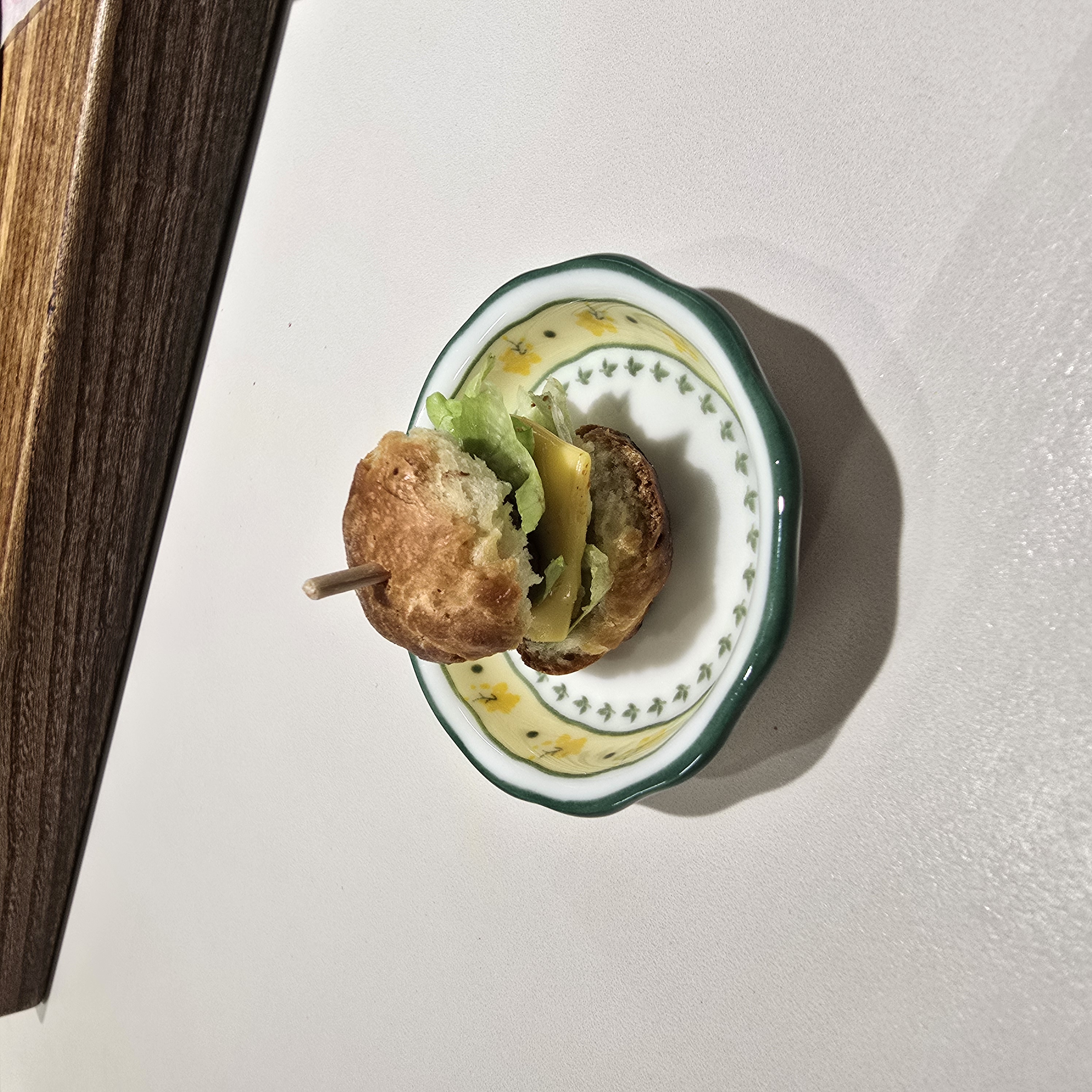 1. 빵 양상추 패티 치즈 양파 양상추 패티 빵 순서대로 얹어줍니다. (중심을 위해 꼬치를 껴주었습니다)