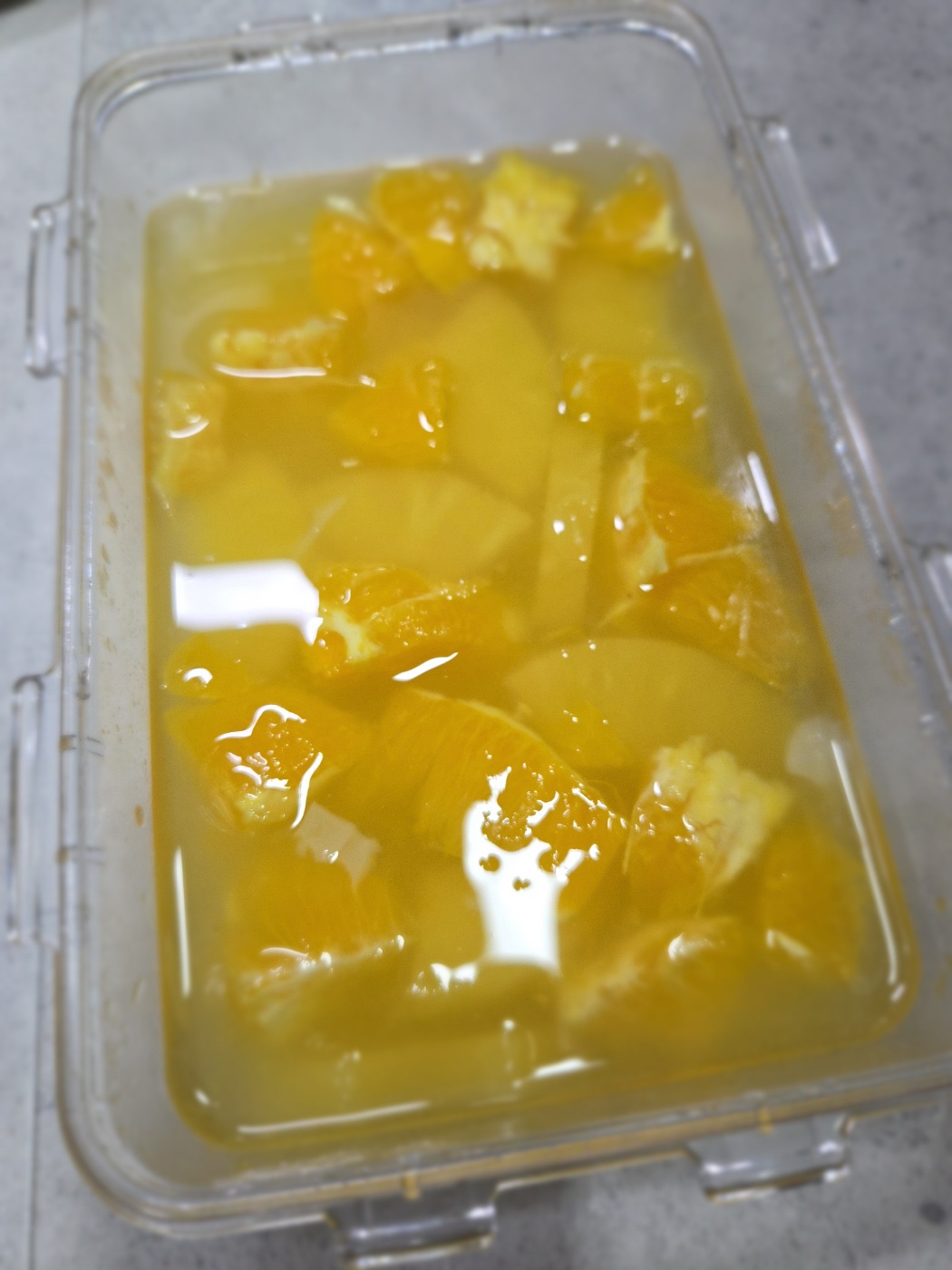 등화로 살 수 있는 배꼽오렌지를 석석 썰어서 뜨끈한 파인애플과 함께 통에 넣습니다.