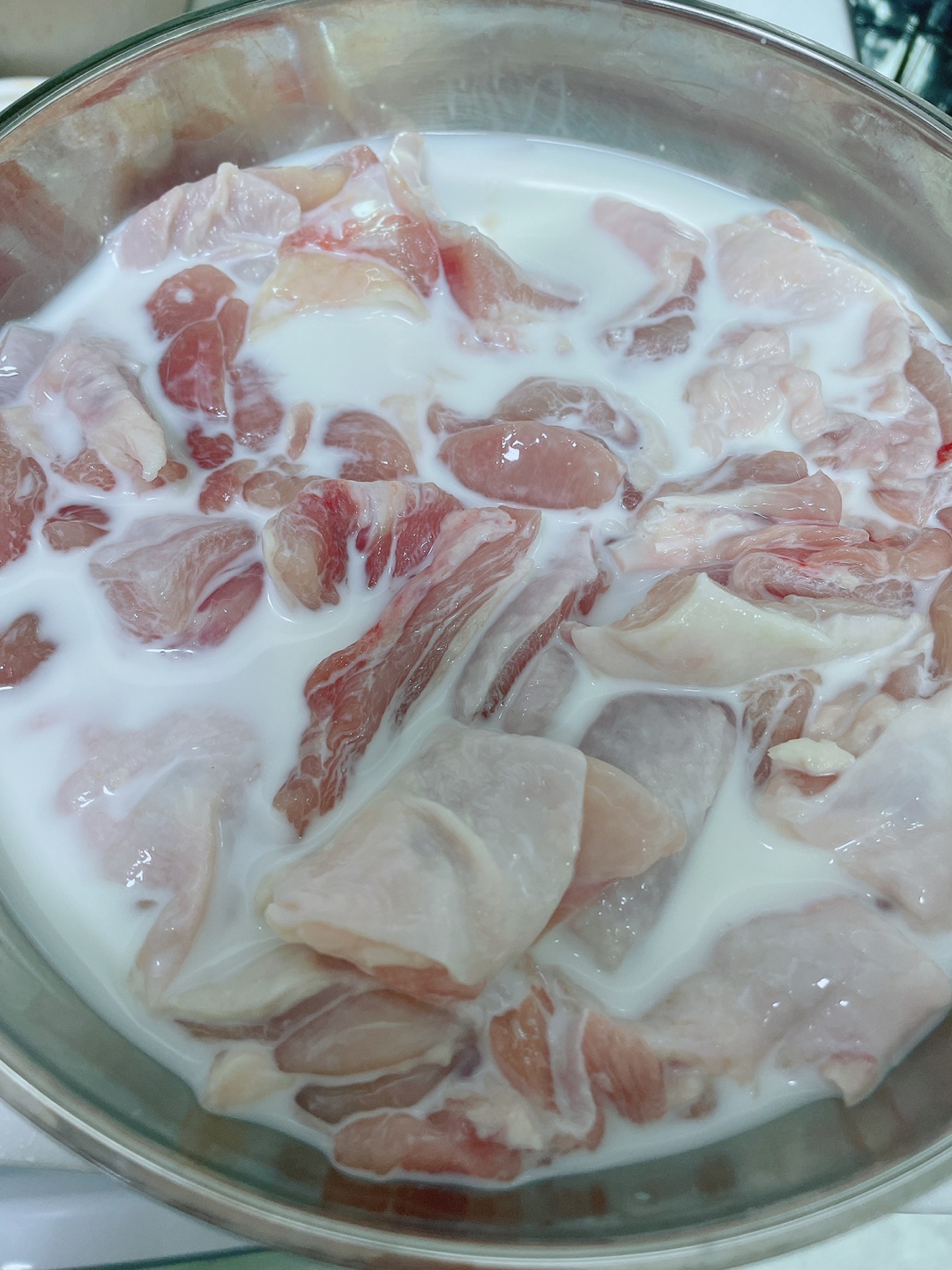 일단 잡내제거를 위해 등화로 산 민꼬리닭을 우유에 30분 정도 재웁니다. 코오~ 재워 코오오옹ㅇ오옭