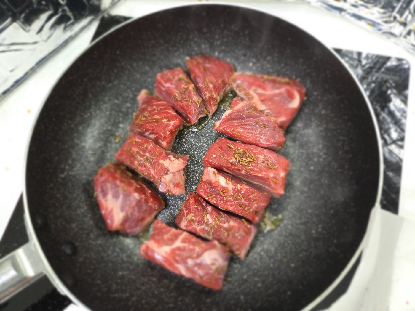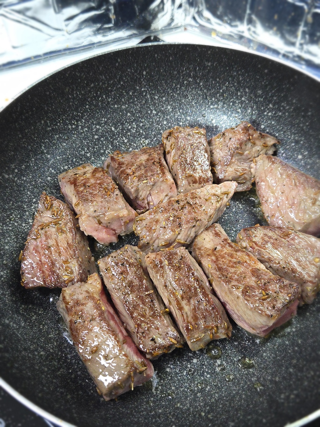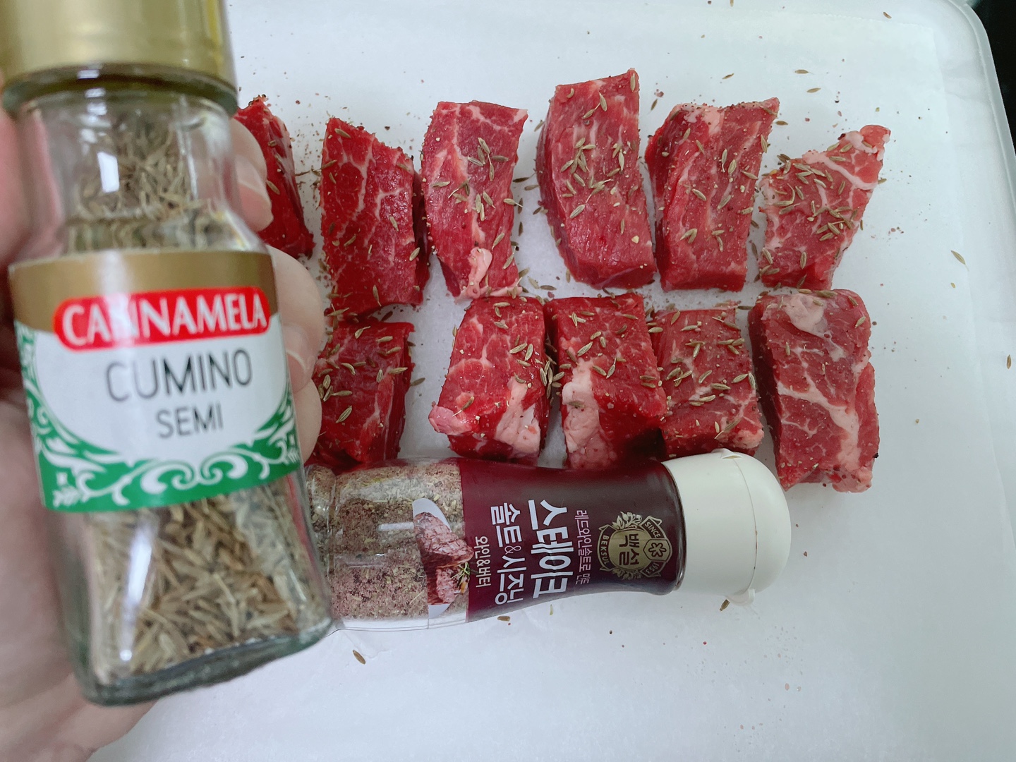 스테이크 시즈닝과 갈색 소두구(큐민)을 뿌려 조물조물 해서 코오 재워둡니다.