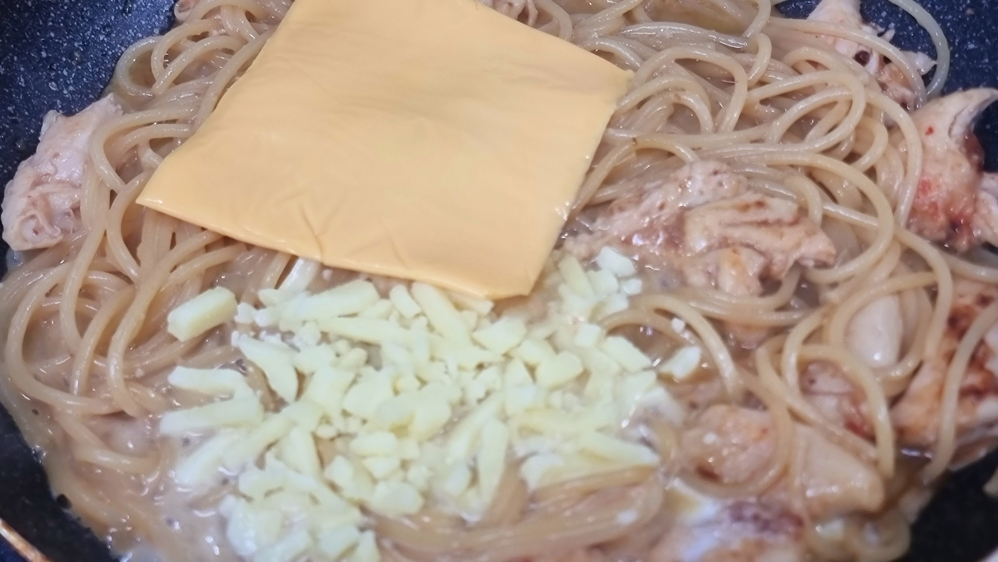 적당히 섞였을 때 갈레안치즈(의 탈을 쓴 모짜렐라+체다치즈)를 넣고 잘 저어주세요