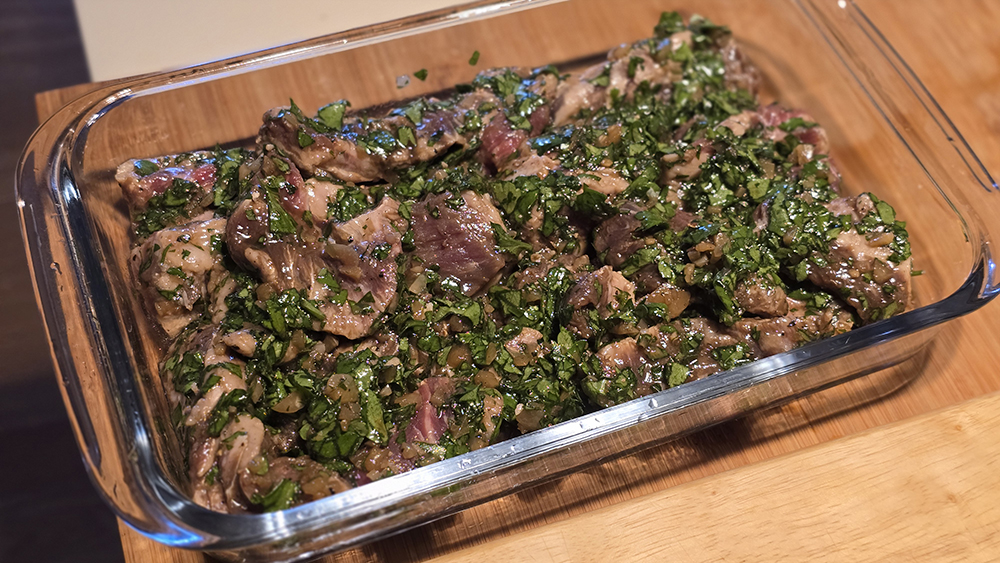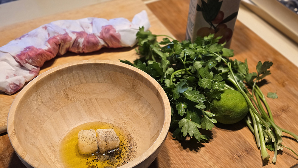 파슬리와 하늘레몬즙을 넣은 양념에 로네크 앞다리살을 넣고 잘 마리네이드 해줍니다.
