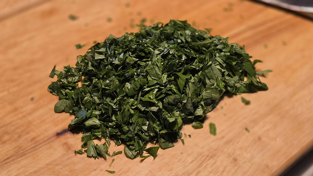 씻어둔 바람 파슬리 한줌은 잎만 떼어내어 잘 다집니다.