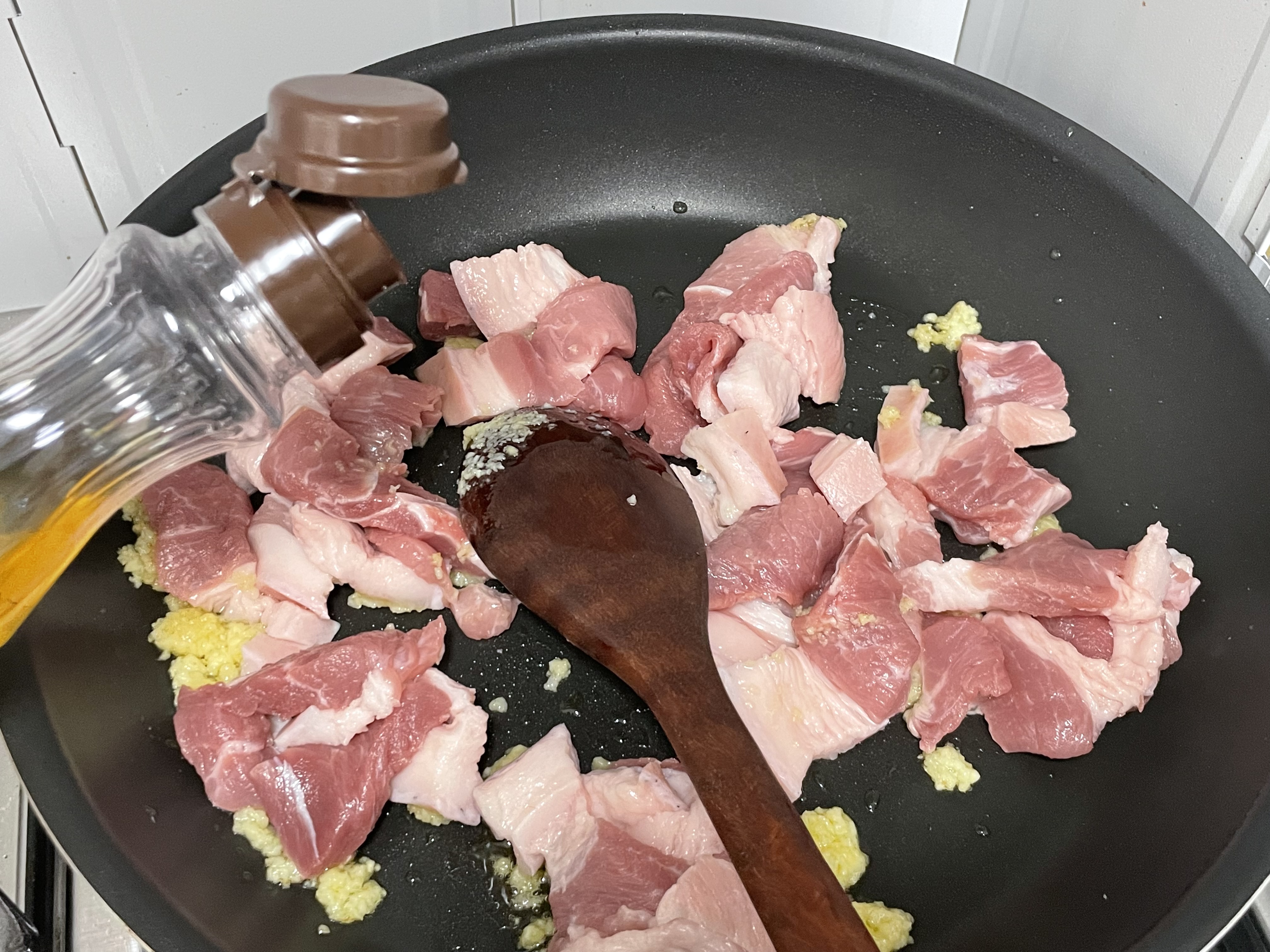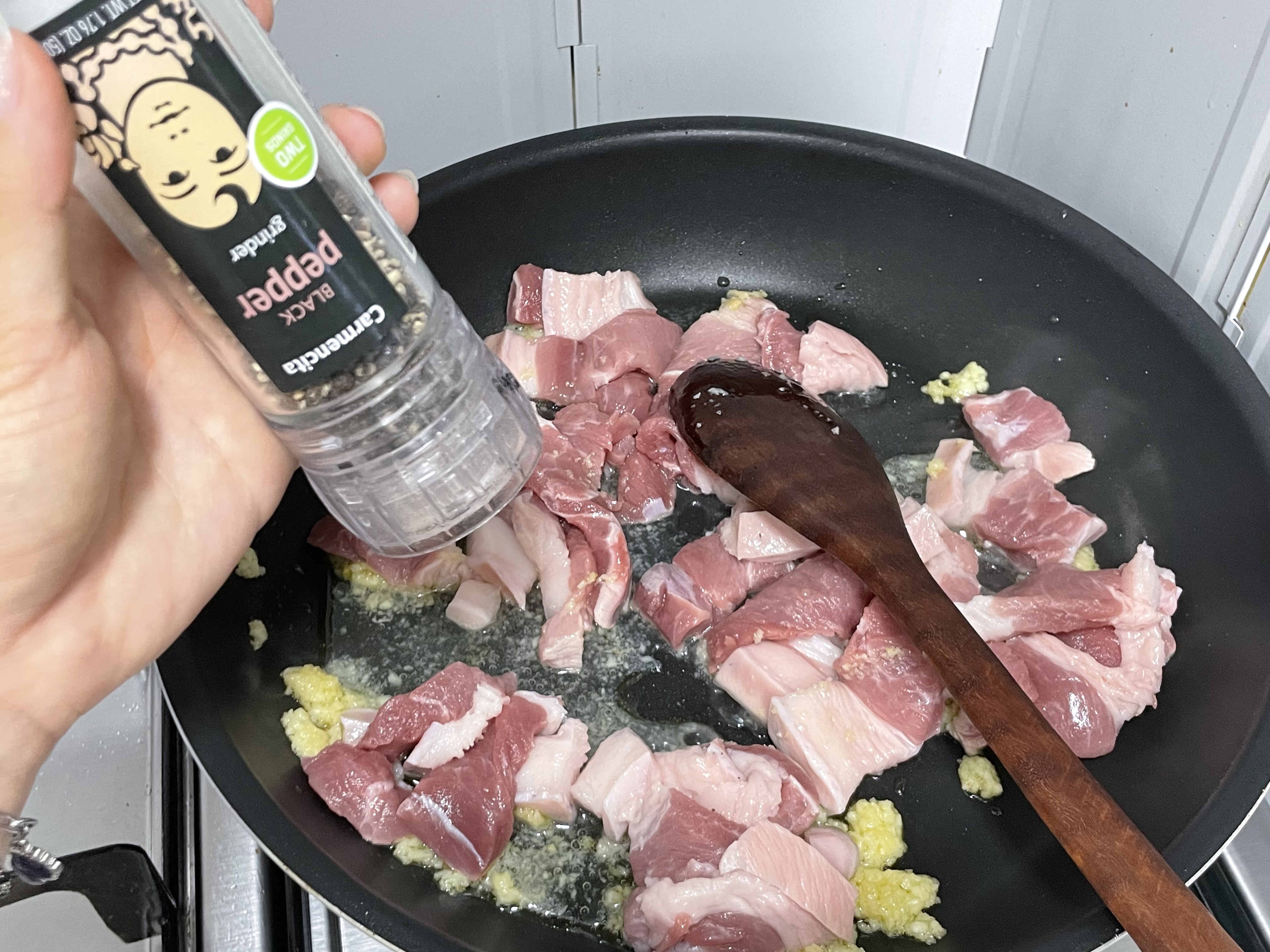 먹기 좋게 썰은 흑돼지를 먼저 넣어주고