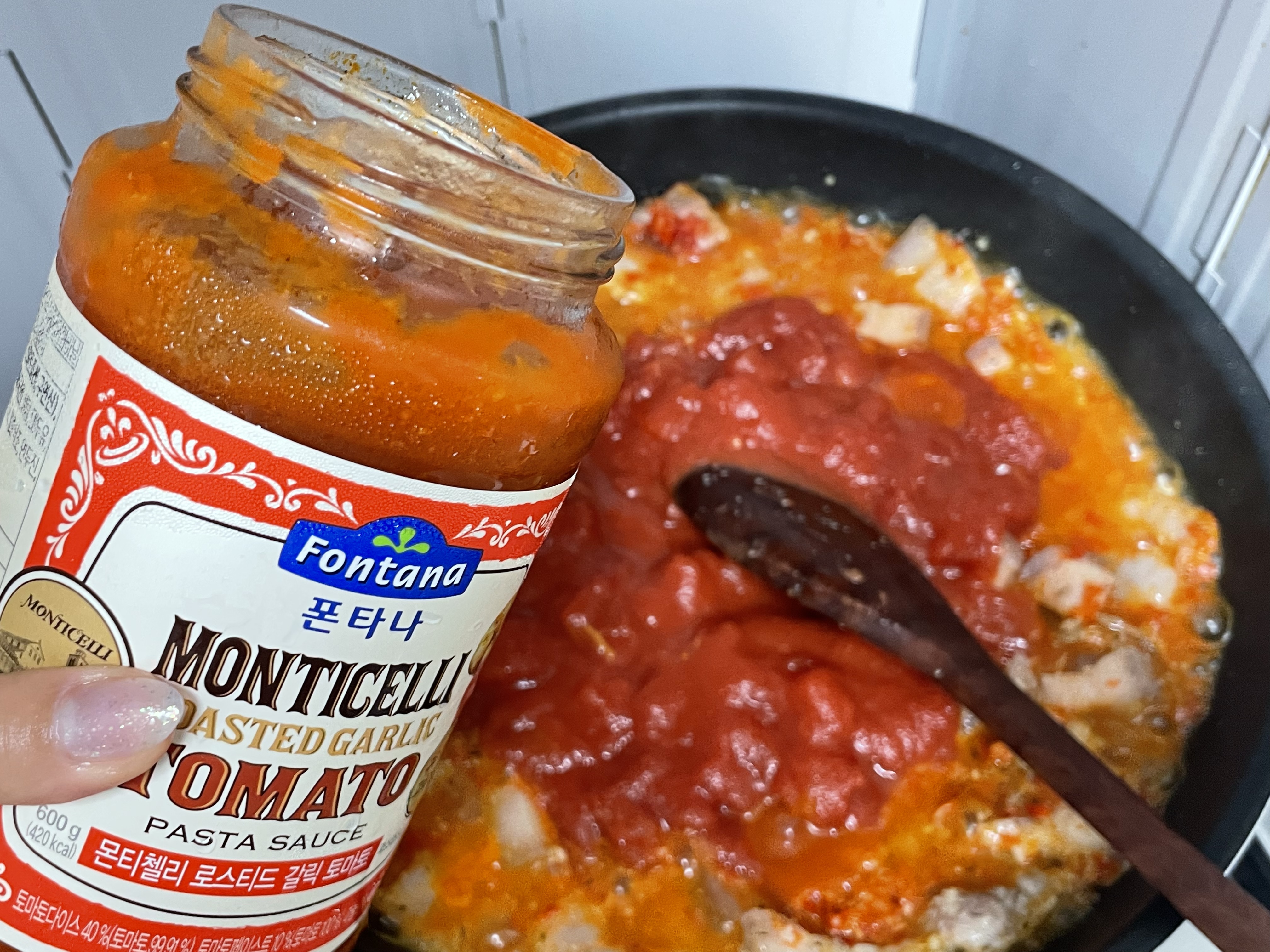 그래서 시판의 힘을 이용해 토마토소스를 조금 함께 넣어줍니다!