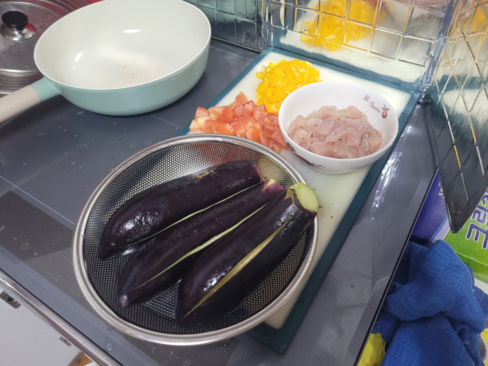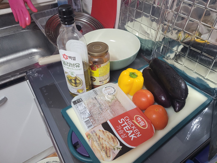 재료는 함사 가슴살 270g, 도마가지 3개, 사베네어 파프리카 1개, 올리브유, 통후추, 피토마토 2개