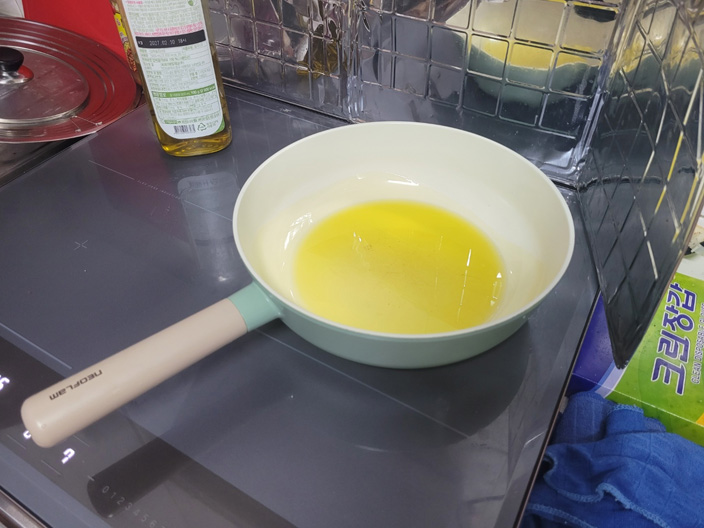 그 다음 약불로 달군 팬에 올리브유를 듬뿍 뿌려주세요