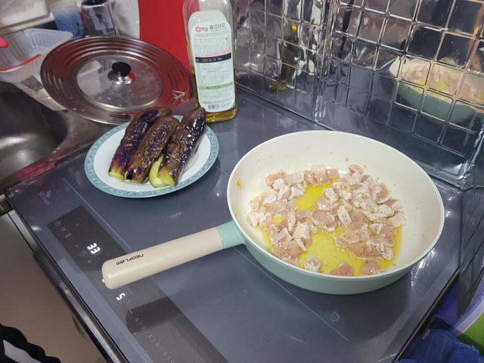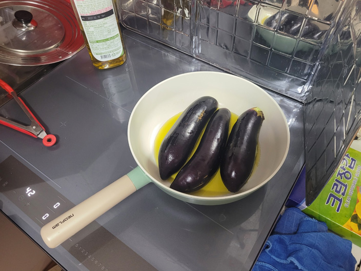 통가지로 요리하는 거기 때문에 잘 안 익을 수 있으니 잘 구워가며 약불에서 서서히 올리브유가 잘 스며들게 구워주세요