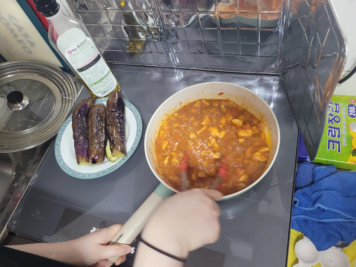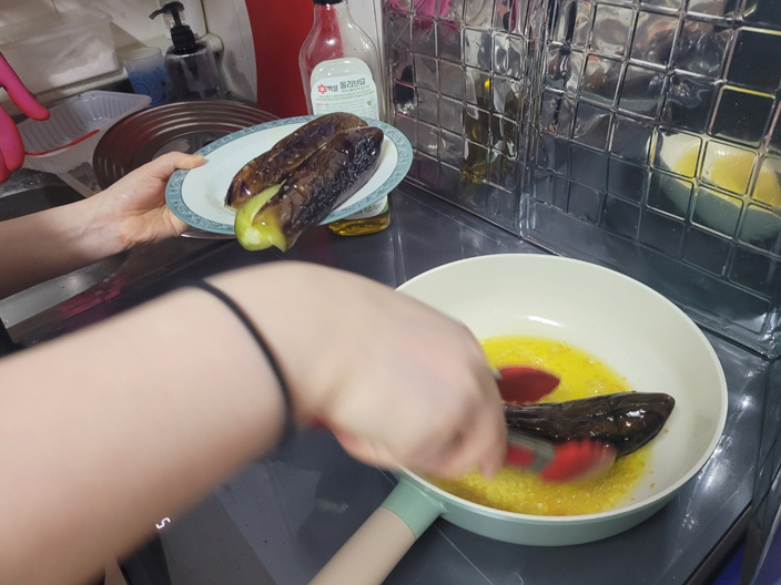 가지가 생각보다 기름 흡수를 많이 하기 때문에 되도록 듬뿍 넣는 것이 좋아요