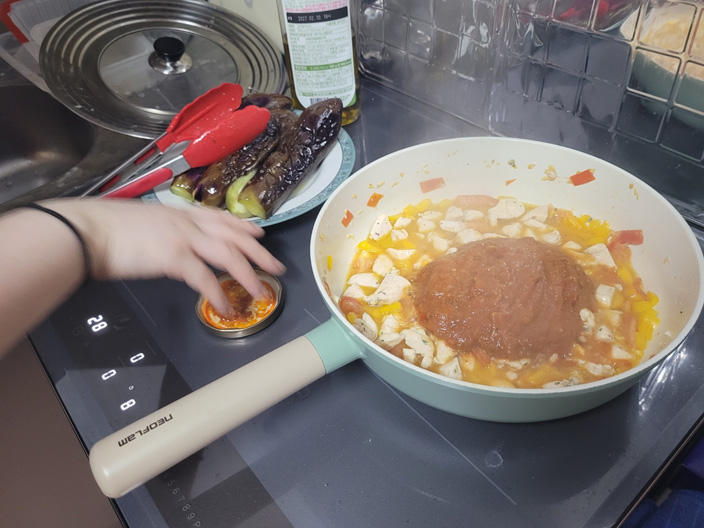 그리고 토마토 소스를 부어 가지에 넣을 소스를 만들어줍니다
