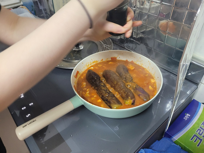 가지에 토마토 소스 맛이 잘 나면 좋겠다 싶어서 잠시 같이 졸여주고 위에 후추도 뿌려줍니다