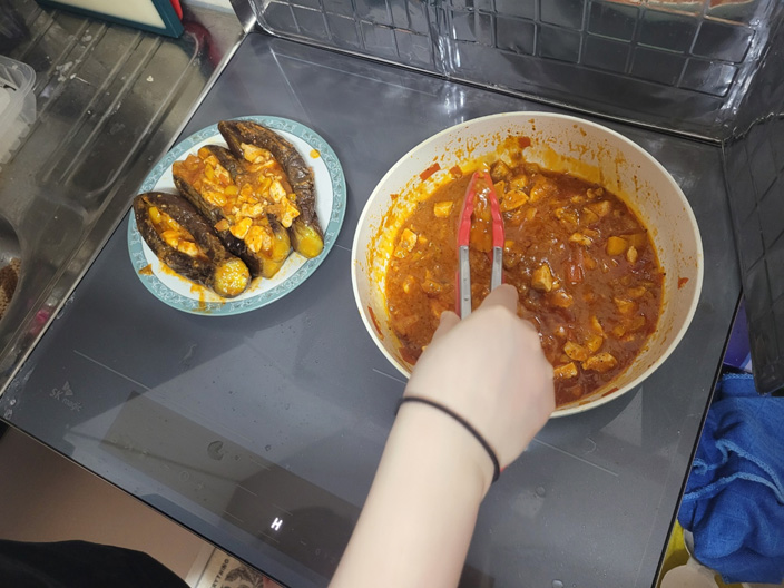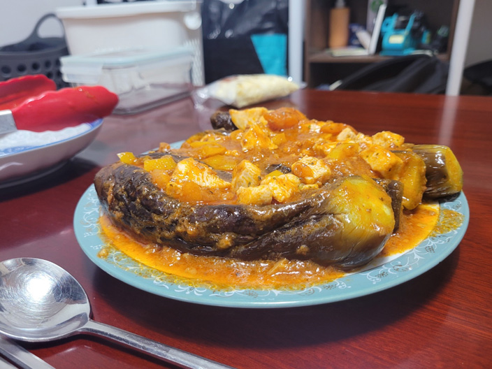 가지 속을 다진 함사 고기와 향신료로 채우고 토마토를 얹어 구운 요리