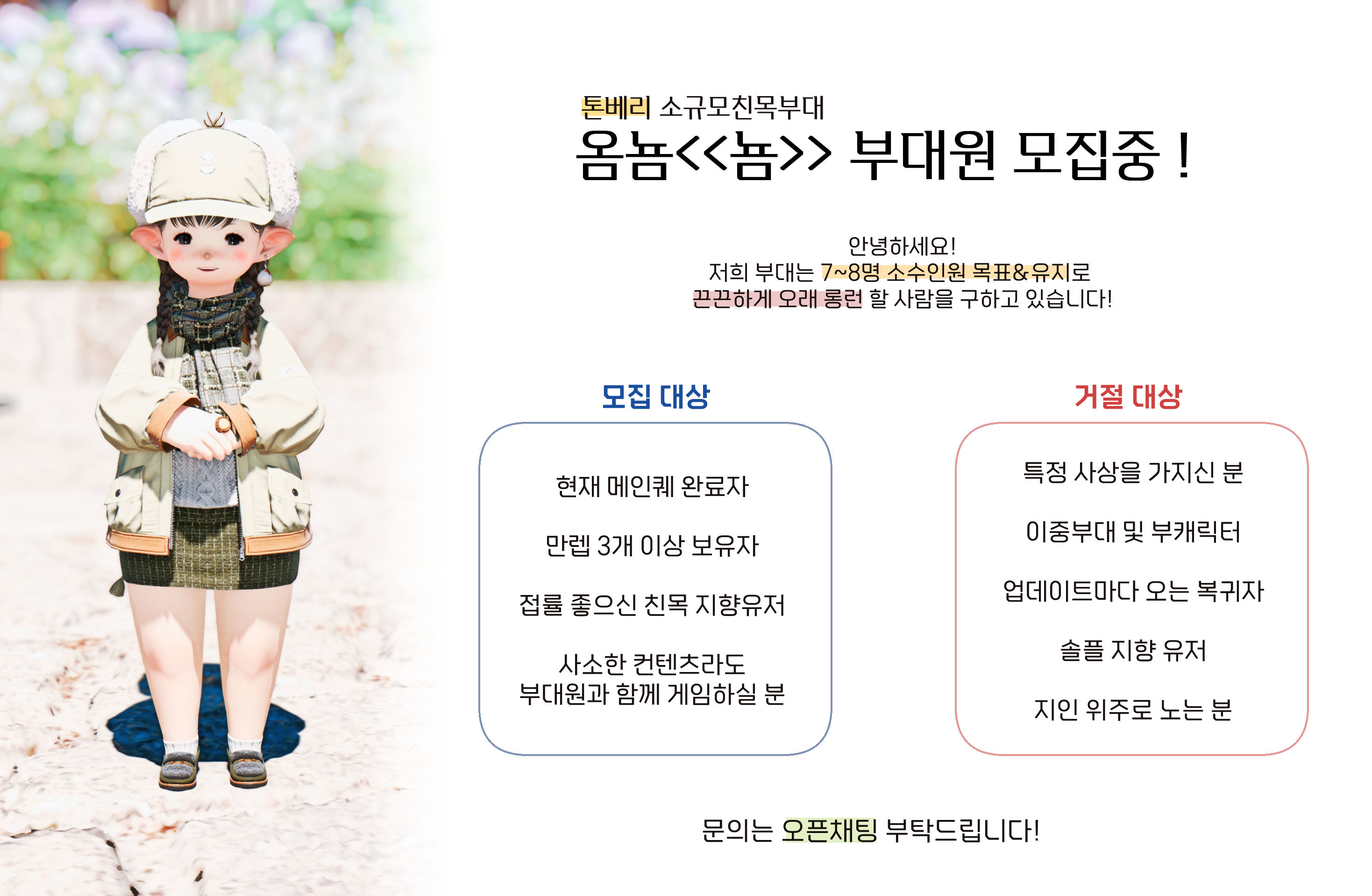 | 20950 | [톤베리] 소규모친목부대 오물오물<냠>에서 부대원을 모집합니다! (0) New Marill | 25-12-12 | 57 | 0 |