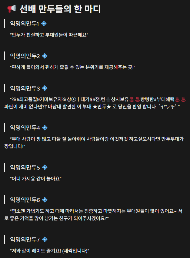 | 20812 | [펜리르] 샛별<<별빛>>부대에서 부대원을 모집중입니다 ~* (0) Picture mose*** | 25-11-16 | 548 | 0 |