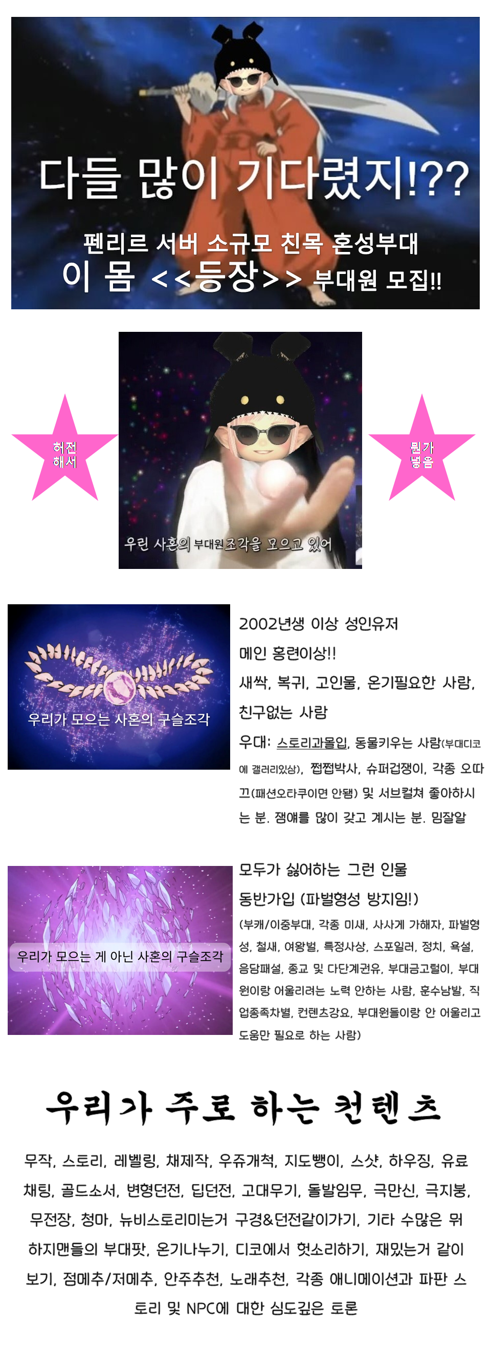 제일 반응속도가 빠른 가입문의는 오픈카톡입미다~ 부담없이 문의주세용~ 궁금한 거 문의주고 가입안해도 되니까 찔러만 봐도 ㅇㅋ새싹분은 효월 후일담 혹은 황금미시는 분 아니면 더이상 받지않아요~!! 참고부탁드립니다! 글고 위에 썼던 것처럼 부대이름 변경했습니다~~~ 첫 시작 어쩔티비 <<롸>> 에서 개냥이발바닥<<말캉>> 에서 지금은 이 몸 <<등장>> 이에오~~ 부대원 설문조사로 바꾼거라 이제 부대이름 안 바꾸고 고정해서 갈 듯 합미다. 모두 많관부 >ㅁ<
