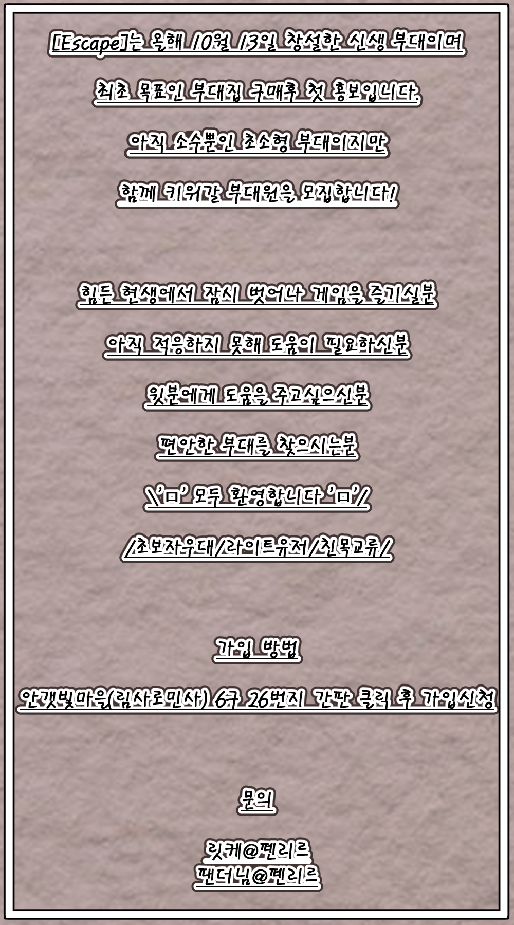 | 20877 | [펜리르] 신생부대 Escape ≪런≫ 에서 신규 대원을 모집합니다. (0) Picture 릿케 | 25-11-28 | 246 | 0 |