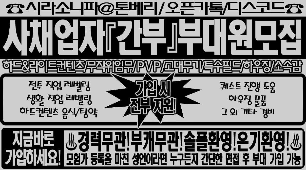 안녕하십니까, 톤베리 자유부대 '사채업자<간부>'에서 신규 부대원을 모집하고 있습니다.