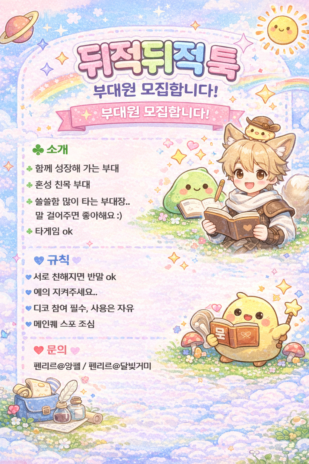| 21538 | [펜리르] 자유부대 에휴예요<<에휴>> 에서 사람을 모집합니다 (0) Picture 유카링 | 26-03-24 | 173 | 0 |