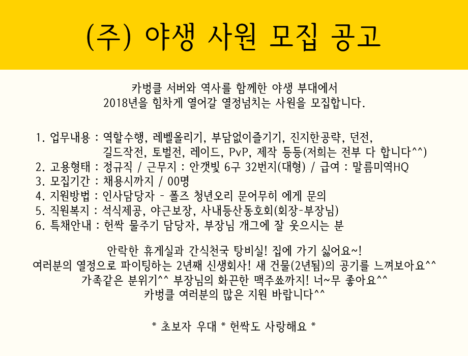 저희 (주)야생 부대는 소중한 인재 여러분의 경력을 따지지 않습니다.