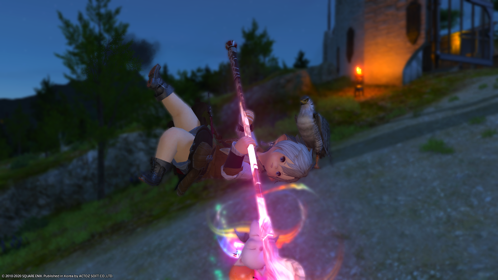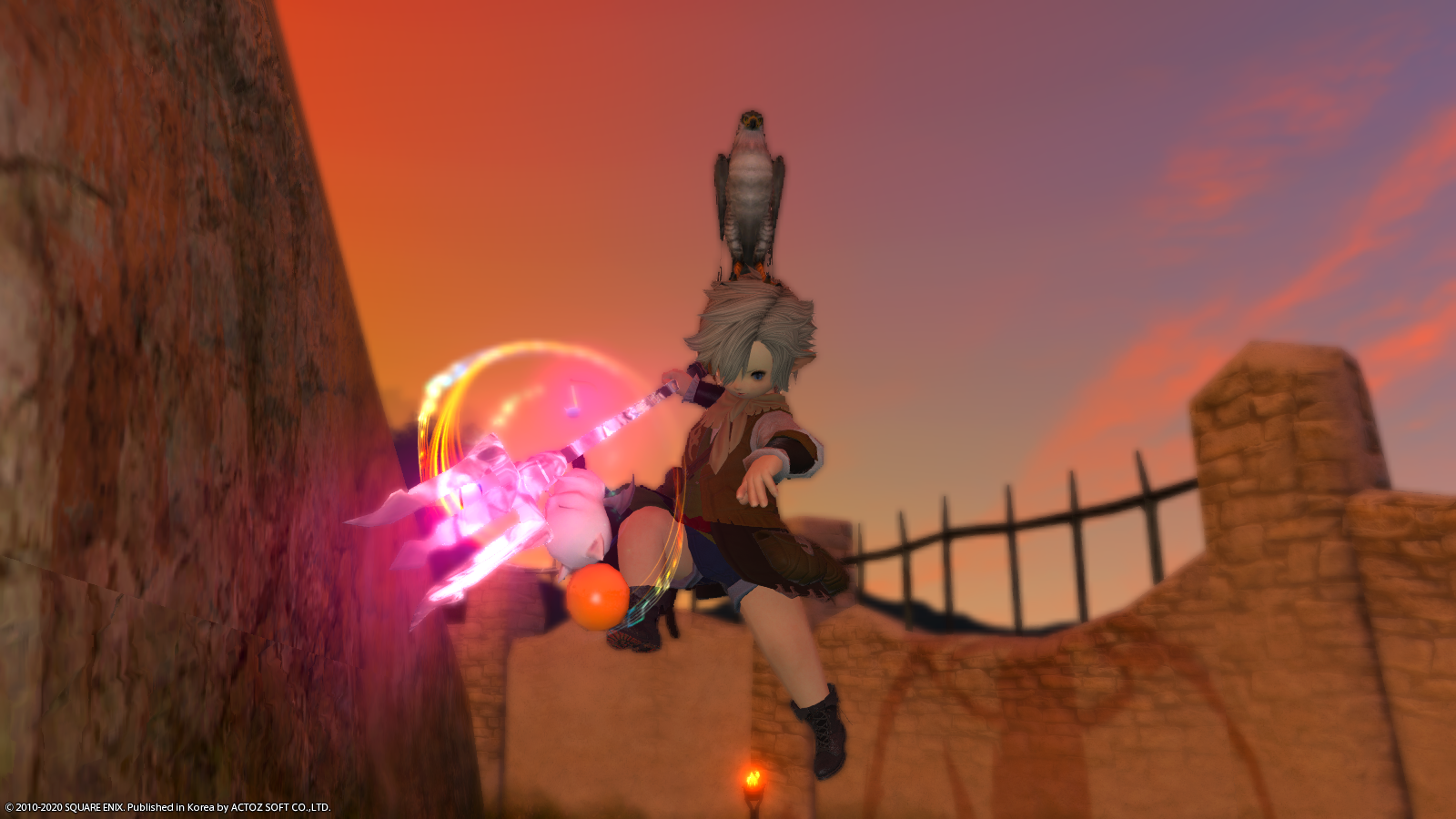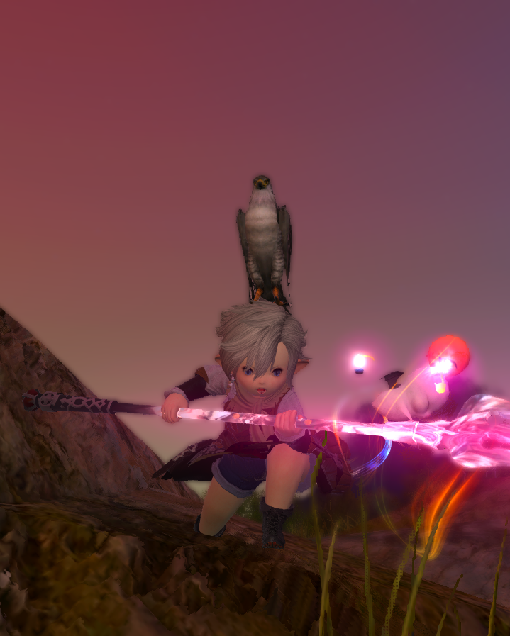 빛의 전사가 아무리 역동적인 자세를 취하고 험하게 전투한다고 해도 꼬마친구(사냥매)는 머리 위에서 떨어지지 않습니다.