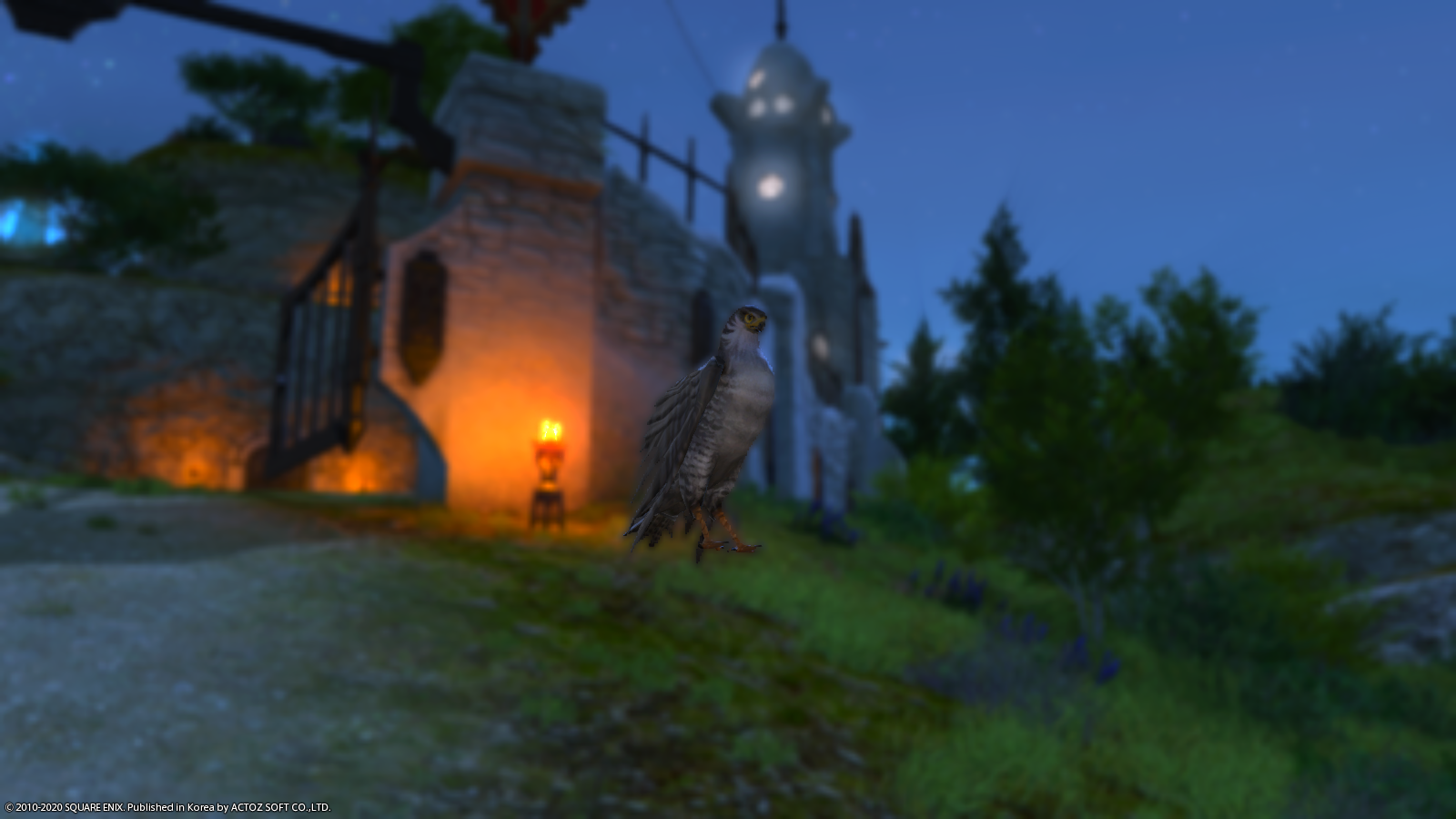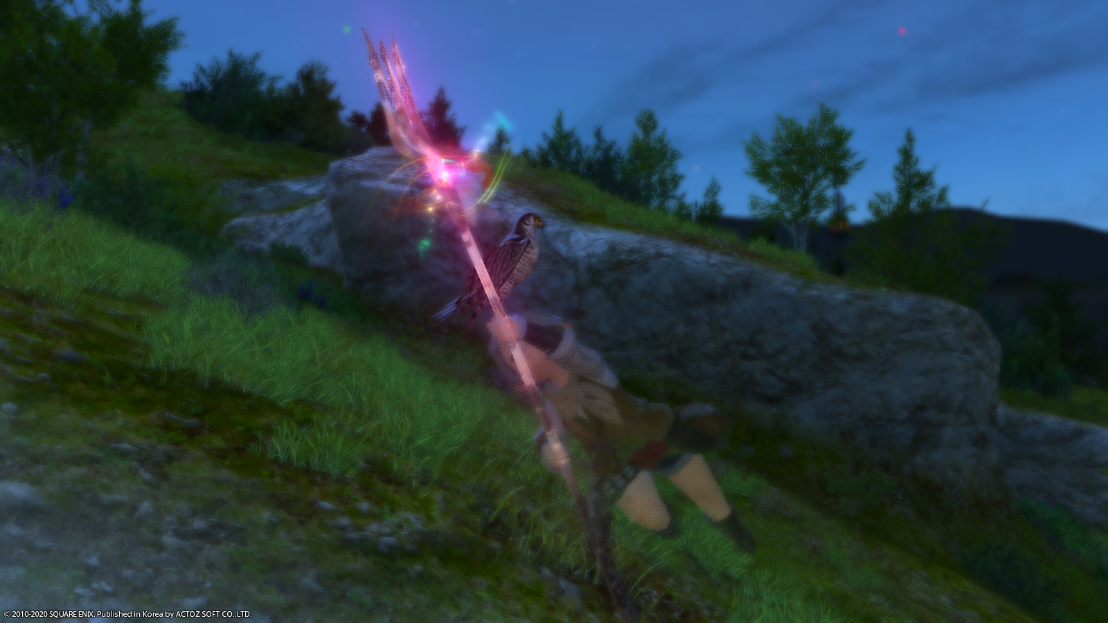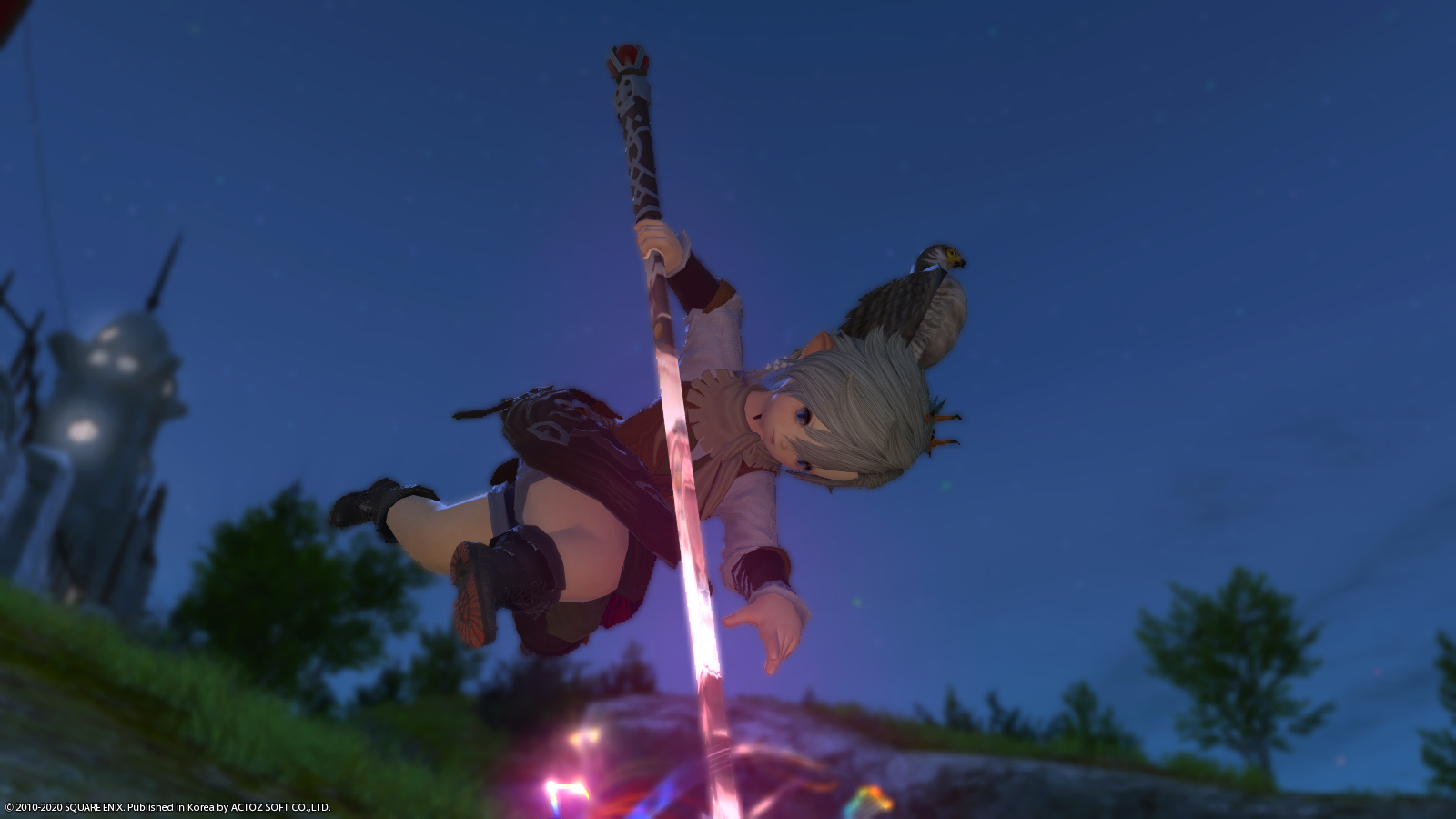 빛의 전사가 아무리 역동적인 자세를 취하고 험하게 전투한다고 해도 꼬마친구(사냥매)는 머리 위에서 떨어지지 않습니다.