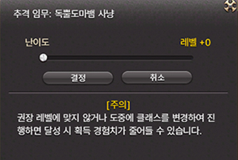 여기서 주의사항 확인 및 난이도 조정 등을 하고 결정 버튼을 클릭하면 길드 의뢰를 시작할 수 있습니다.