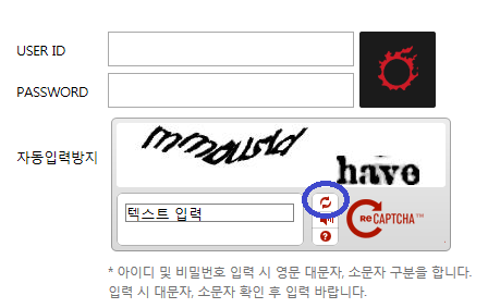 보안 문자 입력 시, 확인이 어려우시다면 반드시 파란색 동그라미의