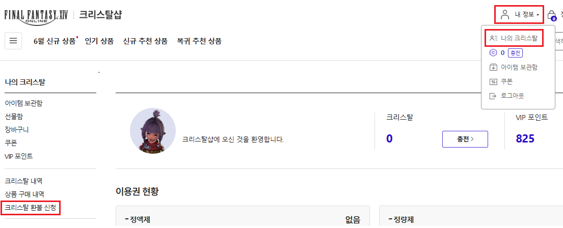 ◆ 환불하려는 아이디로 로그인 후 크리스탈샵 우측 상단의 내 정보 > 나의 크리스탈 > 크리스탈 환불 신청을 클릭합니다.