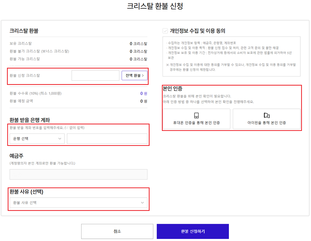 ※ 크리스탈 환불 신청 시 신청한 크리스탈은 즉시 차감되며, 환불 예정 금액은 약 10일(영업일 기준) 내에 요청하신 계좌로 입금됩니다.