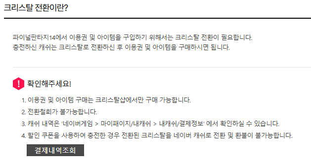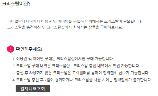 ※ 크리스탈 환불 신청을 완료한 후에는 신청 취소가 불가하니 신중하게 접수를 부탁 드립니다.