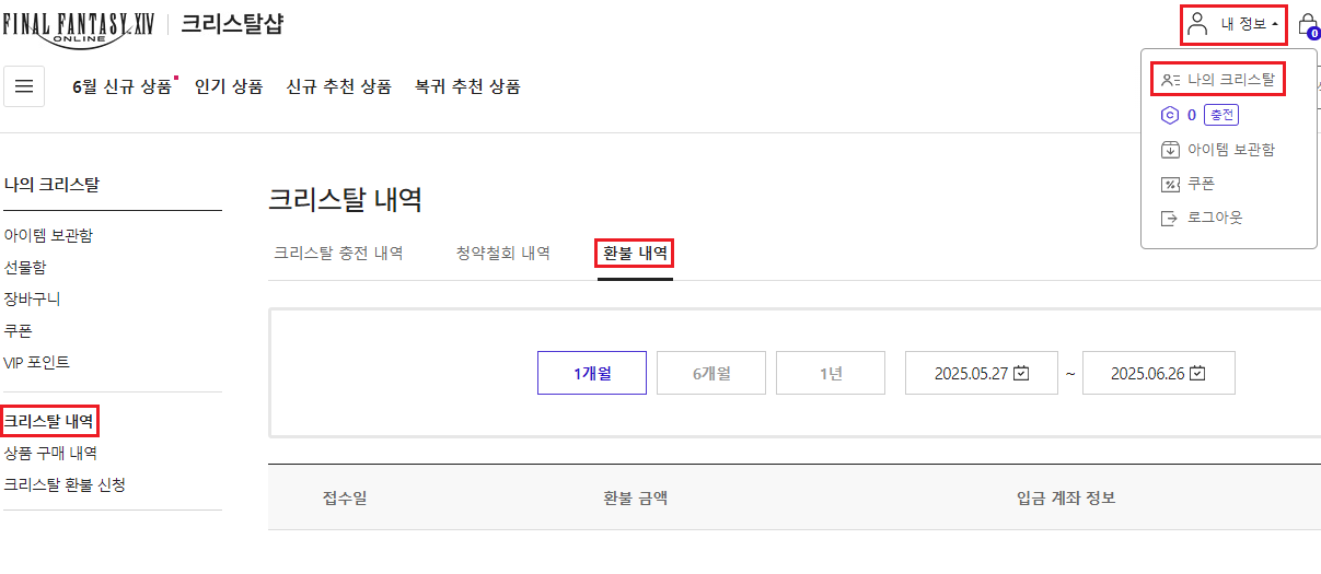 ◆ 신청하신 환불 접수가 완료되면 내 정보 > 나의 크리스탈 > 크리스탈 내역 > 환불 내역에서 신청하신 환불 내역을 조회하실 수 있습니다.